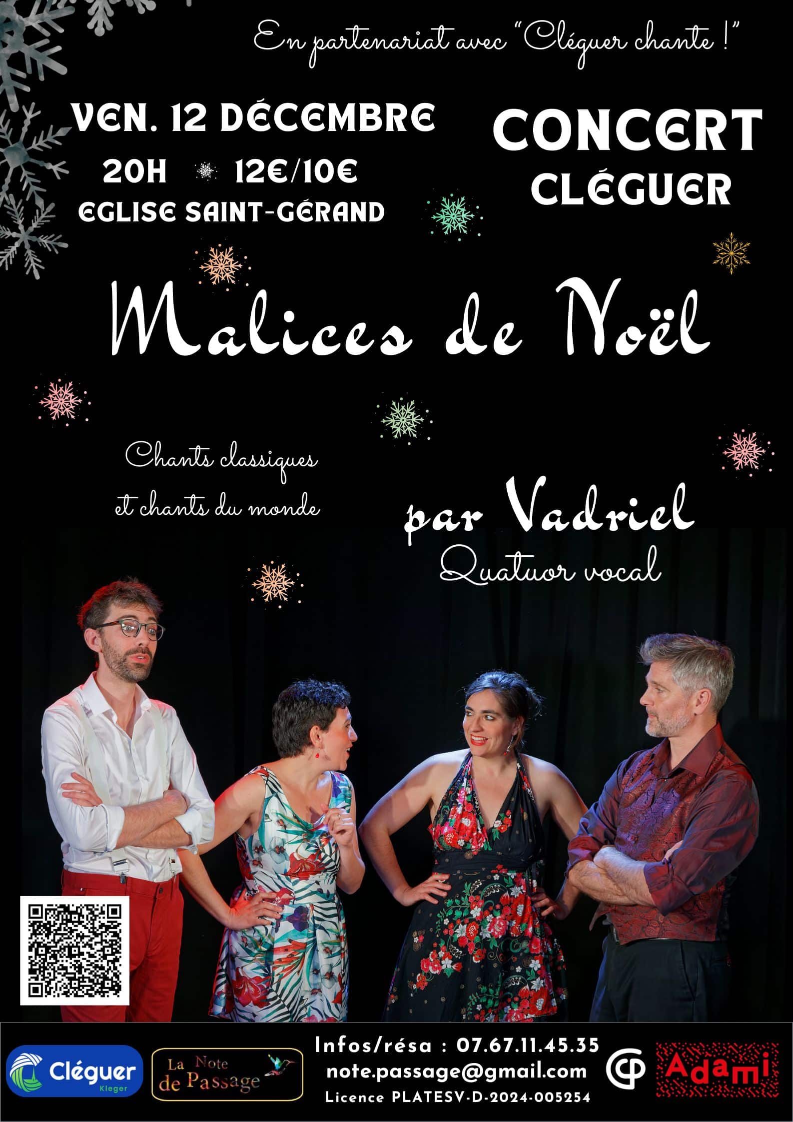 ➡️ Avec leur nouveau spectacle « Malices de Noël », les quatre chanteurs virtuoses de Vadriel revisitent les classiques du genre dans une mise en scène malicieuse et costumée… Un concert qui ravira les amoureux des belles voix tout en dépoussiérant le format classique ! »